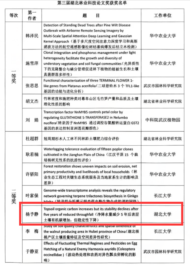 2023年7月至9月,湖北林学会组织开展了第三届湖北林业科技论文奖评选活动,并按照《湖北林业科技论文奖评选办法》,经形式审查、专家评审组评审、网上公示等程序,发布了关于第三届湖北林业科技论文奖评选结果的通报。william威廉亚洲官方杨予静副教授的论文《Topsoil organic carbon increases but its stability declines after five years of reduced throughfall》荣获该科技论文奖二等奖,杨予静副教授为第一作者,william威廉亚洲官方为第一单位。