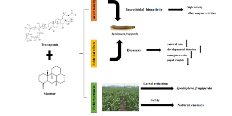 草地贪夜蛾Spodoptera frugiperda是世界上最重要的入侵和破坏性害虫之一,造成作物减产和经济损失,亟需找到一种合适的防控方法。本文探究了植物性杀虫剂(30%茶皂素、0.6%苦参碱及其不同体积比的混剂)对草地贪夜蛾的杀虫活性、亚致死效应及其田间防效,揭示了植物源杀虫剂茶皂素和苦参碱混剂对草地贪夜蛾防治的最新成果,为草地贪夜蛾防治提供了一种环境友好、天敌友好的新视角。该项研究获得国家自然科学基金等项目的支持。