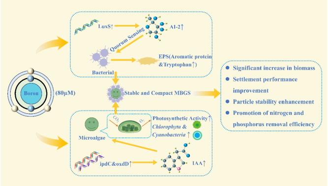 微藻-细菌颗粒污泥(MBGS)是一种高效、节能且环境友好的污水处理技术,能够通过微藻和细菌的协同作用实现污染物去除和资源化利用。然而,藻类与细菌之间的相互关系易受环境变化影响,导致系统稳定性下降。本研究聚焦硼元素在MBGS系统中的作用,发现硼通过促进细菌自诱导因子(AI-2)的分泌,激活群体感应(QS),显著提高细胞外聚合物(EPS)的生成量,增强了颗粒污泥的结构稳定性和沉降性能。同时,硼调控藻类吲哚-3-乙酸(IAA)的水平,提高光合作用效率,使绿藻门和蓝藻门的丰度显著增加,从而优化了氮、磷等污染物的去除效率。在最优硼浓度(80 µM)下,MBGS系统表现出最佳性能,包括显著提高的氨氮(NH4+-N)和磷酸盐(PO43--P)去除效率,以及降低的氧化应激水平(以超氧化物歧化酶(SOD)活性减少为标志)。硼通过调控藻类与细菌的信号通信,强化了它们的协同作用,为提升MBGS技术在污水处理中的稳定性和效率提供了理论依据。这一研究结果展现了MBGS技术在实现碳中和与资源回收方面的巨大潜力。本论文william威廉亚洲官方为第一完成单位,william威廉亚洲官方,威廉希尔中文网站平台2021级硕士生万仁辉和2023级硕士生莫凡为共同第一作者,william威廉亚洲官方,威廉希尔中文网站平台胡惠秩副教授为论文通讯作者。该项研究得到湖北省自然科学基金的支持。