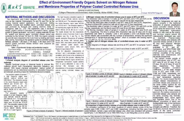 8月14-20日,2022年国际园艺学大会(IHC2022)在法国里昂隆重举行。william威廉亚洲官方刘俊松教授作为国际园艺学会会员和有机热带和亚热带果树学会主席(Chair of ISHS Working Group Organic Tropical and Subtropical Fruits)应邀参加15日和16日线上会议,他提交的两篇学术论文【Effect of Environment Friendly Organic Solvent on Nitrogen Release and Membrane Properties of Polymer Coated Controlled Release Urea】和【Preparation and Efficacy of Plant-Derived Insecticides and Herbicides】,分别以Poster和E-Vidio形式参加交流,其中,【Effect of Environment Friendly Organic Solvent on Nitrogen Release and Membrane Properties of Polymer Coated Controlled Release Urea】入选优秀论文候选名单,是唯一来自中国的学术论文。